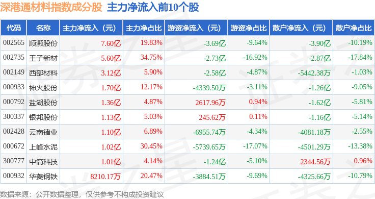 资金流向方面,深港通材料(983015)指数成份股当日主力资金净流出合计39.66亿元,游资资金净流出合计6.75亿元,散户资金净流入合计46.41亿元。成份股资金流向详情见下表: