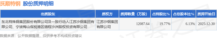 证券之星消息,抚顺特钢(600399)12月31日公开信息显示,股东东北特殊钢集团股份有限公司及一致行动人江苏沙钢集团有限公司、宁波梅山保税港区锦程沙洲股权投资有限公司向江苏沙钢集团有限公司合计质押1.21亿股,占总股本6.13%。质押详情见下表: