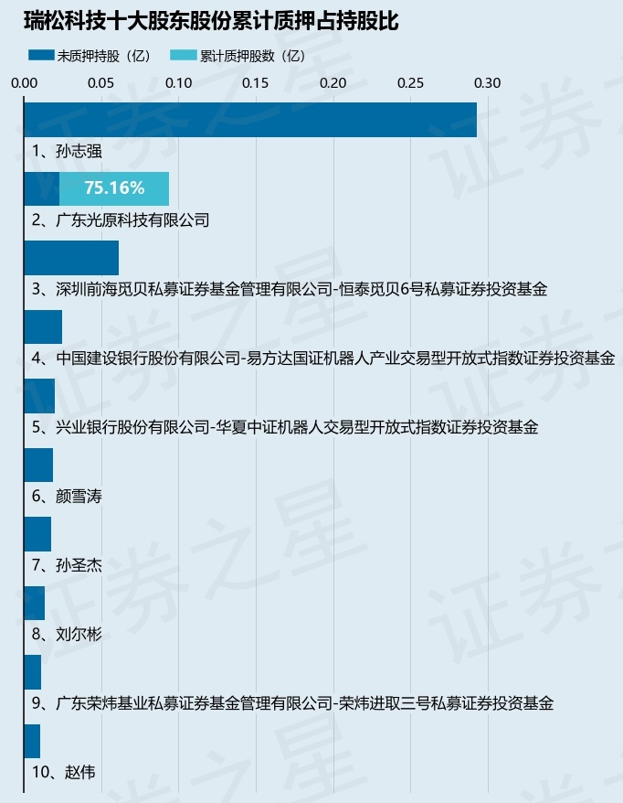 截止本公告日,股东广东光原科技有限公司已累计质押股份703.5万股,占其持股总数的75.16%。本次质押后瑞松科技十大股东的累计质押股份占持股比例(占持股比例的计算以公司最新一期财务报表公布的十大股东的持股总数为基准)见下图: