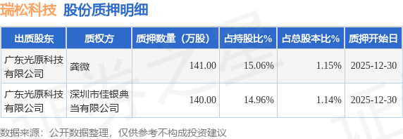 证券之星消息,瑞松科技(688090)12月31日公开信息显示,股东广东光原科技有限公司向龚微、深圳市佳银典当有限公司合计质押281.0万股,占总股本2.29%。质押详情见下表: