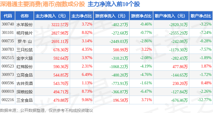资金流向方面,深港通主要消费(港币)(983022)指数成份股当日主力资金净流出合计14.64亿元,游资资金净流入合计3.58亿元,散户资金净流入合计11.06亿元。成份股资金流向详情见下表: