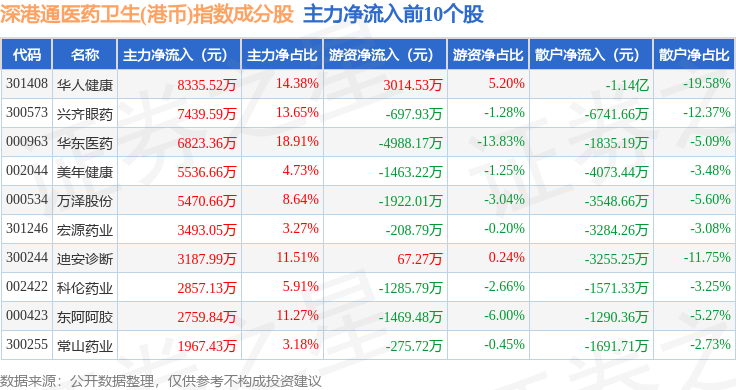 资金流向方面,深港通医药卫生(港币)(983024)指数成份股当日主力资金净流出合计15.71亿元,游资资金净流入合计2.04亿元,散户资金净流入合计13.67亿元。成份股资金流向详情见下表:
