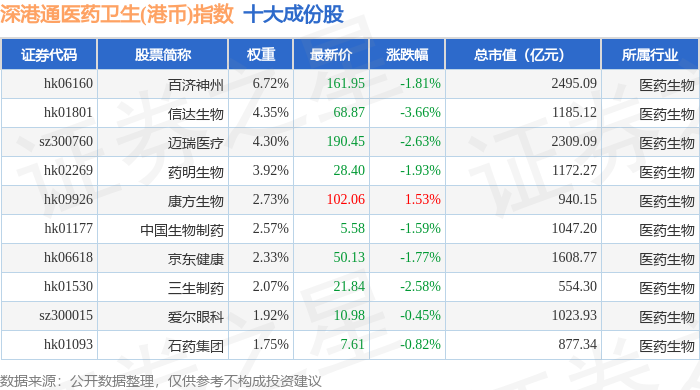 深港通医药卫生(港币)(983024)指数十大成份股详情如下: