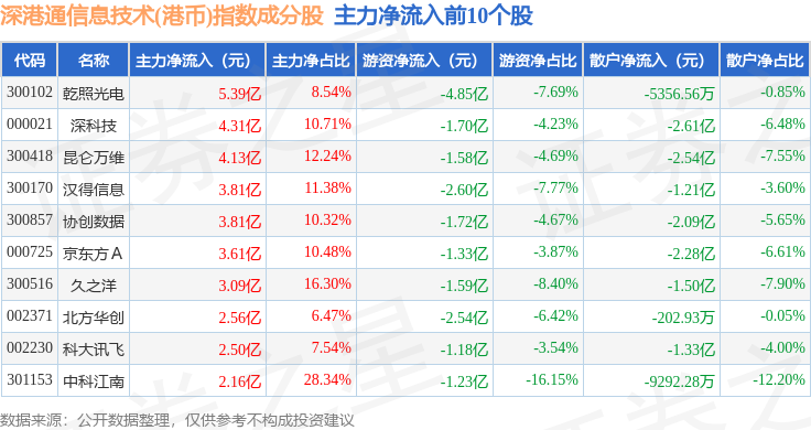 资金流向方面,深港通信息技术(港币)(983028)指数成份股当日主力资金净流出合计53.0亿元,游资资金净流出合计3.91亿元,散户资金净流入合计56.91亿元。成份股资金流向详情见下表:
