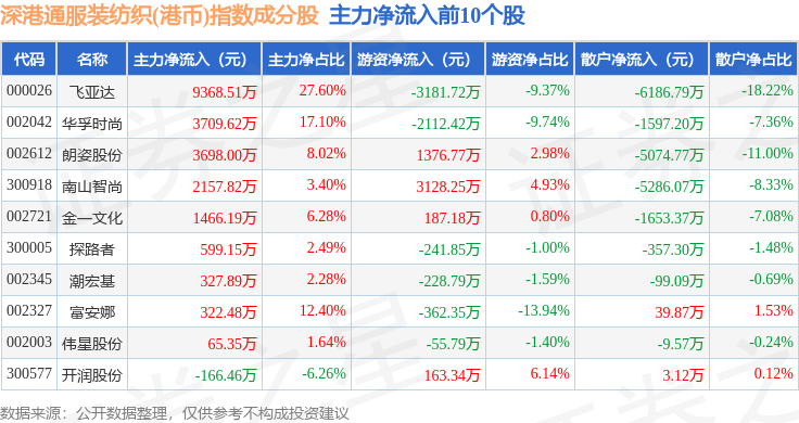 资金流向方面,深港通服装纺织(港币)(983042)指数成份股当日主力资金净流出合计8742.08万元,游资资金净流入合计6704.74万元,散户资金净流入合计2037.33万元。成份股资金流向详情见下表: