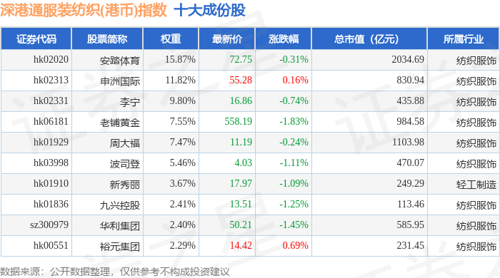 深港通服装纺织(港币)(983042)指数十大成份股详情如下: