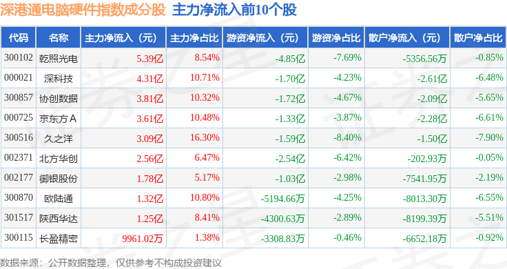 资金流向方面,深港通电脑硬件(983043)指数成份股当日主力资金净流出合计46.42亿元,游资资金净流出合计1.19亿元,散户资金净流入合计47.61亿元。成份股资金流向详情见下表:
