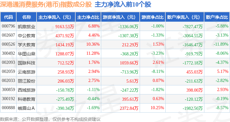 资金流向方面,深港通消费服务(港币)(983046)指数成份股当日主力资金净流入合计4349.82万元,游资资金净流入合计3217.49万元,散户资金净流出合计7567.31万元。成份股资金流向详情见下表: