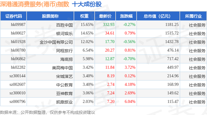 深港通消费服务(港币)(983046)指数十大成份股详情如下: