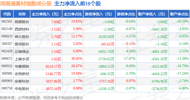 资金流向方面,深港通基材(983061)指数成份股当日主力资金净流出合计29.6亿元,游资资金净流出合计4.69亿元,散户资金净流入合计34.29亿元。成份股资金流向详情见下表: