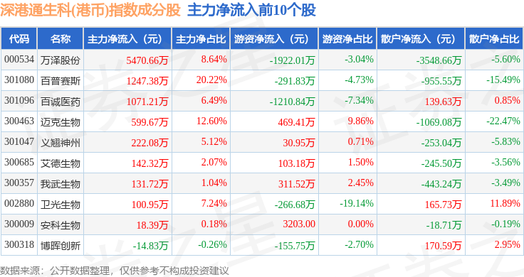 资金流向方面,深港通生科(港币)(983060)指数成份股当日主力资金净流出合计3.51亿元,游资资金净流入合计7595.24万元,散户资金净流入合计2.75亿元。成份股资金流向详情见下表: