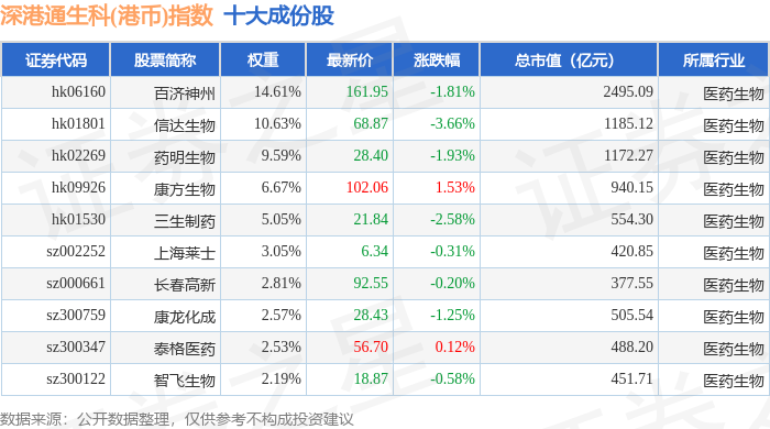 深港通生科(港币)(983060)指数十大成份股详情如下: