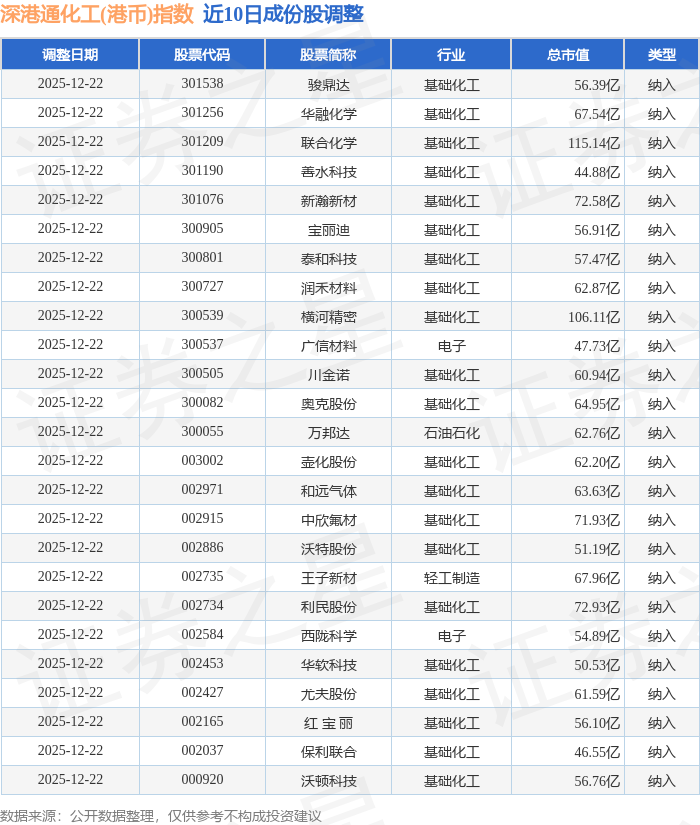 近10日内深港通化工(港币)(983064)指数成份股做了调整,新纳入了25只股票。