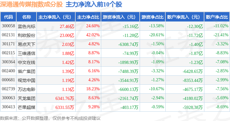 资金流向方面,深港通传媒(983075)指数成份股当日主力资金净流入合计58.84亿元,游资资金净流出合计26.95亿元,散户资金净流出合计31.89亿元。成份股资金流向详情见下表:
