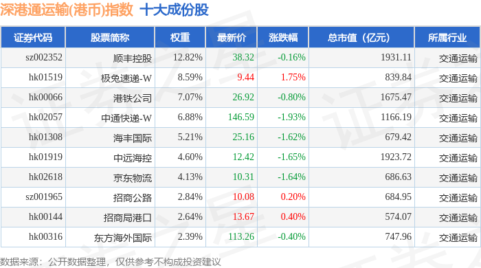 深港通运输(港币)(983078)指数十大成份股详情如下: