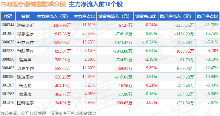 资金流向方面,内地医疗器械(983103)指数成份股当日主力资金净流出合计4.44亿元,游资资金净流入合计1.17亿元,散户资金净流入合计3.27亿元。成份股资金流向详情见下表: