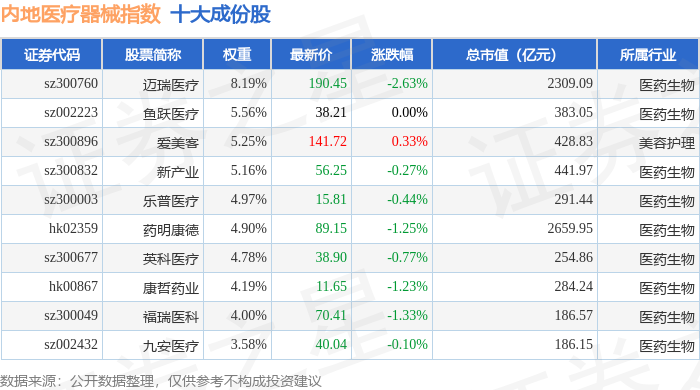 证券之星消息,12月31日,内地医疗器械(983103)指数报收于1741.31点,跌0.76%,成交68.29亿元,换手率0.82%。当日该指数成份股中,上涨的有14家,迪安诊断以2.79%的涨幅领涨,下跌的有33家,微创机器人-B以8.72%的跌幅领跌。