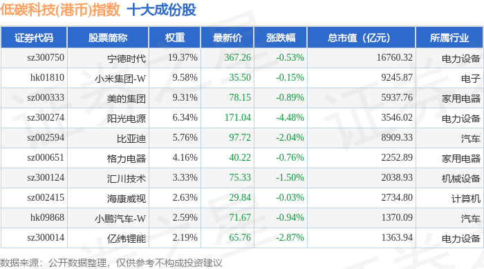 低碳科技(港币)(983161)指数十大成份股详情如下: