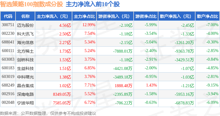 资金流向方面,智选策略100(989015)指数成份股当日主力资金净流出合计90.1亿元,游资资金净流入合计32.3亿元,散户资金净流入合计57.8亿元。成份股资金流向详情见下表: