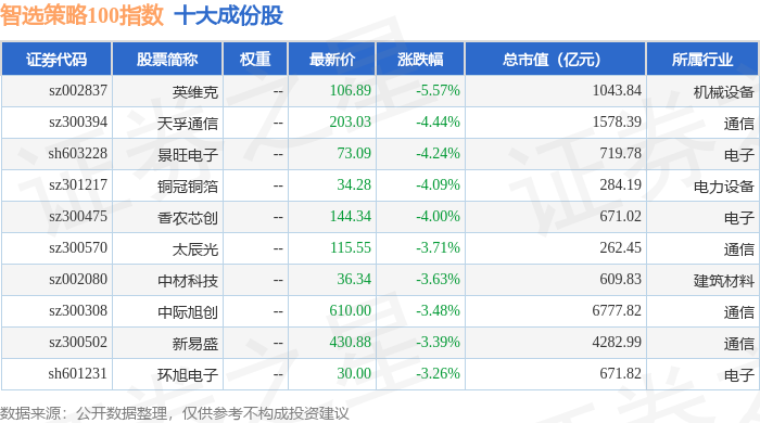 证券之星消息,12月31日,智选策略100(989015)指数报收于4237.22点,跌1.53%,成交1773.88亿元,换手率2.66%。当日该指数成份股中,上涨的有30家,精测电子以7.31%的涨幅领涨,下跌的有69家,英维克以5.57%的跌幅领跌。