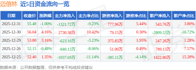 证券之星消息,截至2025年12月31日收盘,迈信林(688685)报收于55.48元,下跌1.0%,换手率1.75%,成交量2.57万手,成交额1.43亿元。
