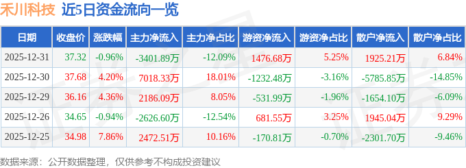 证券之星消息,截至2025年12月31日收盘,禾川科技(688320)报收于37.32元,下跌0.96%,换手率5.02%,成交量7.58万手,成交额2.81亿元。