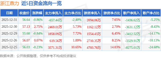 证券之星消息,截至2025年12月31日收盘,浙江鼎力(603338)报收于56.64元,下跌0.86%,换手率0.96%,成交量4.84万手,成交额2.74亿元。