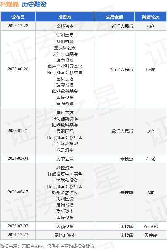 证券之星消息,根据天眼查APP于12月28日公布的信息整理,朴烯晶新能源材料(上海)有限公司C轮融资,融资额近亿人民币,参与投资的机构包括金城资本。