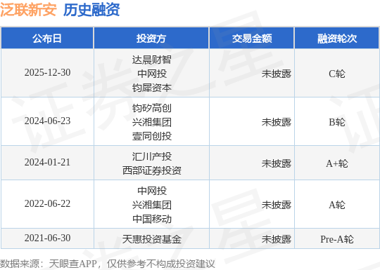证券之星消息,根据天眼查APP于12月30日公布的信息整理,湖南泛联新安信息科技有限公司C轮融资,融资额未披露,参与投资的机构包括达晨财智,中网投,钧犀资本。