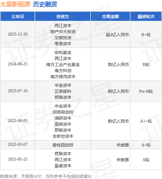 证券之星消息,根据天眼查APP于12月30日公布的信息整理,重庆太蓝新能源有限公司B+轮融资,融资额超4亿人民币,参与投资的机构包括两江资本,物产中大投资,交银投资,零度资本。
