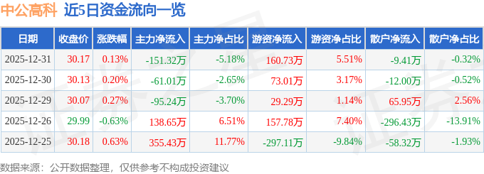 证券之星消息,截至2025年12月31日收盘,中公高科(603860)报收于30.17元,上涨0.13%,换手率1.45%,成交量9679.0手,成交额2918.95万元。