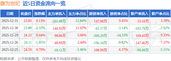 证券之星消息,截至2025年12月31日收盘,康为世纪(688426)报收于23.83元,上涨0.13%,换手率1.71%,成交量6566.0手,成交额1565.46万元。