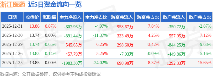 证券之星消息,截至2025年12月31日收盘,浙江医药(600216)报收于13.86元,上涨0.87%,换手率0.92%,成交量8.83万手,成交额1.22亿元。