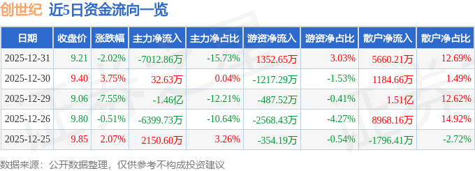 证券之星消息,截至2025年12月31日收盘,创世纪(300083)报收于9.21元,下跌2.02%,换手率3.23%,成交量48.28万手,成交额4.46亿元。