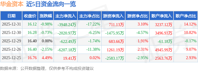 证券之星消息,截至2025年12月31日收盘,华金资本(000532)报收于16.12元,下跌0.98%,换手率4.13%,成交量14.17万手,成交额2.29亿元。