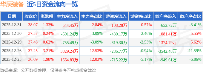 证券之星消息,截至2025年12月31日收盘,华辰装备(300809)报收于38.07元,上涨1.33%,换手率3.35%,成交量5.04万手,成交额1.92亿元。