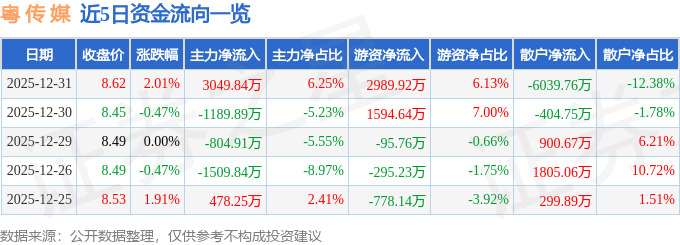 证券之星消息,截至2025年12月31日收盘,粤 传 媒(002181)报收于8.62元,上涨2.01%,换手率4.96%,成交量56.31万手,成交额4.88亿元。