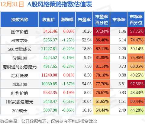风格策略指数方面,国信价值的市盈率百分位较高,为97.34%。而300成长的市盈率百分位较低,为54.44%。