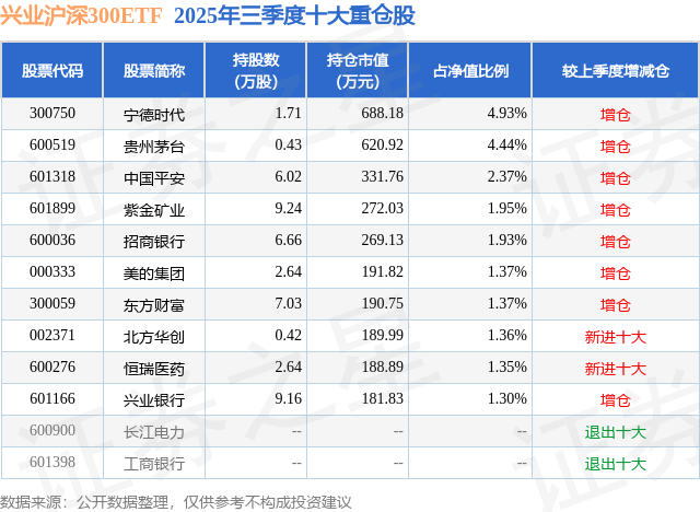 兴业沪深300ETF基金成立于2020年9月11日,基金经理为张诗悦 徐成城,基金跟踪标的为沪深300指数,成立以来超额回报为2.16%,近一个月超额回报为0.17%。最新披露的基金持仓数据显示,截止2025年9月30日,该基金第一大重仓股为宁德时代(300750),持股占比为4.93%。