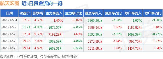 证券之星消息,截至2025年12月31日收盘,航天宏图(688066)报收于32.56元,上涨4.33%,换手率13.57%,成交量35.45万手,成交额11.27亿元。