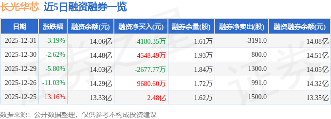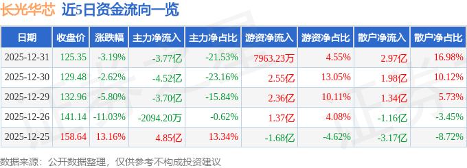 证券之星消息,截至2025年12月31日收盘,长光华芯(688048)报收于125.35元,下跌3.19%,换手率7.87%,成交量13.87万手,成交额17.52亿元。
