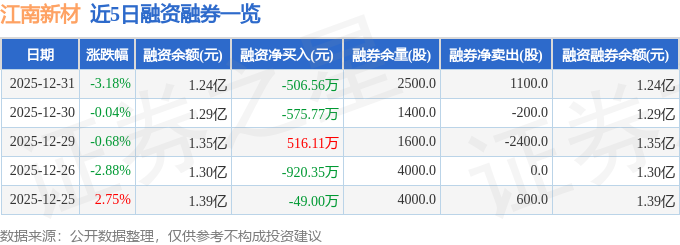 证券之星消息,截至2025年12月31日收盘,江南新材(603124)报收于78.87元,下跌3.18%,换手率6.15%,成交量1.8万手,成交额1.42亿元。