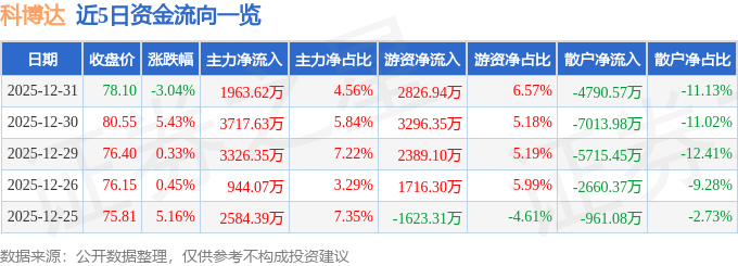 证券之星消息,截至2025年12月31日收盘,科博达(603786)报收于78.1元,下跌3.04%,换手率1.36%,成交量5.49万手,成交额4.3亿元。