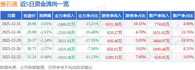 证券之星消息,截至2025年12月31日收盘,壹石通(688733)报收于28.98元,下跌3.01%,换手率2.71%,成交量5.42万手,成交额1.58亿元。