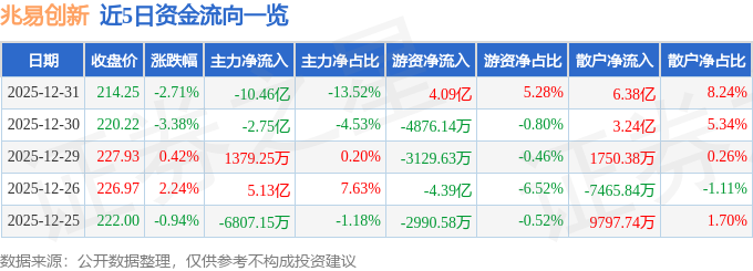 证券之星消息,截至2025年12月31日收盘,兆易创新(603986)报收于214.25元,下跌2.71%,换手率5.31%,成交量35.46万手,成交额77.41亿元。