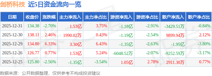 证券之星消息,截至2025年12月31日收盘,剑桥科技(603083)报收于134.38元,下跌2.7%,换手率11.05%,成交量30.44万手,成交额40.75亿元。