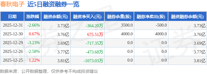 春秋电子融资融券信息显示,融资方面,当日融资买入5682.79万元,融资偿还6046.99万元,融资净偿还364.2万元。融券方面,融券卖出0.0股,融券偿还500.0股,融券余量3500.0股,融券余额5.65万元。融资融券余额3.73亿元。
