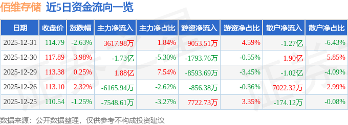 证券之星消息,截至2025年12月31日收盘,佰维存储(688525)报收于114.79元,下跌2.63%,换手率3.67%,成交量17.07万手,成交额19.71亿元。