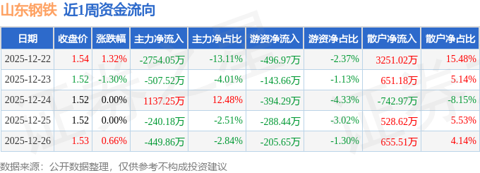 资金流向数据方面,本周山东钢铁主力资金合计净流出2814.36万元,游资资金合计净流出1529.0万元,散户资金合计净流入4343.35万元。本周资金流向一览见下表: