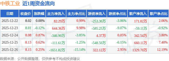资金流向数据方面,本周中铁工业主力资金合计净流出1383.68万元,游资资金合计净流出1060.57万元,散户资金合计净流入2444.25万元。本周资金流向一览见下表: